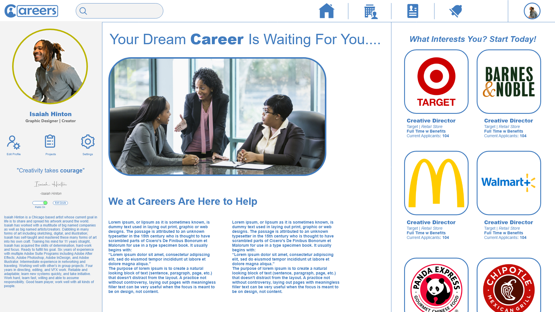 The inspiration for the brand comes from famous career assisting apps, including LinkedIn and Indeed. There interface runs different, but have similar components that are key for a successful career building platform.